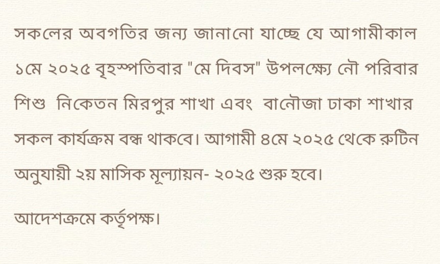 সকলের অবগতির জন্য জানানো যাচ্ছে যে আগামীকাল ১মে ২০২৫ বৃহস্পতিবার "মে দিবস" উপলক্ষ্যে নৌ পরিবার শিশু নিকেতন মিরপুর শাখা এবং বানৌজা ঢাকা শাখার সকল কার্যক্রম বন্ধ থাকবে। আগামী ৪মে ২০২৫ থেকে রুটিন অনুযায়ী ২য় মাসিক মূল্যায়ন- ২০২৫ শুরু হবে।