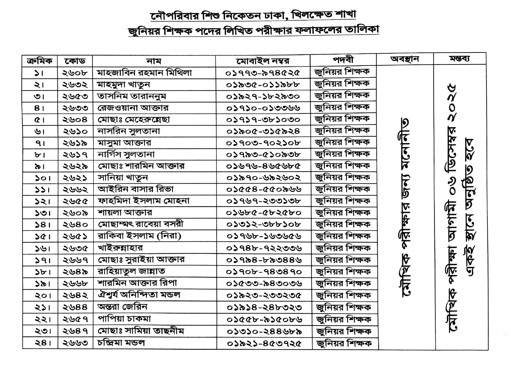 খিলক্ষেত শাখার শিক্ষক নিয়োগ পরীক্ষার লিখিত ফলাফল |