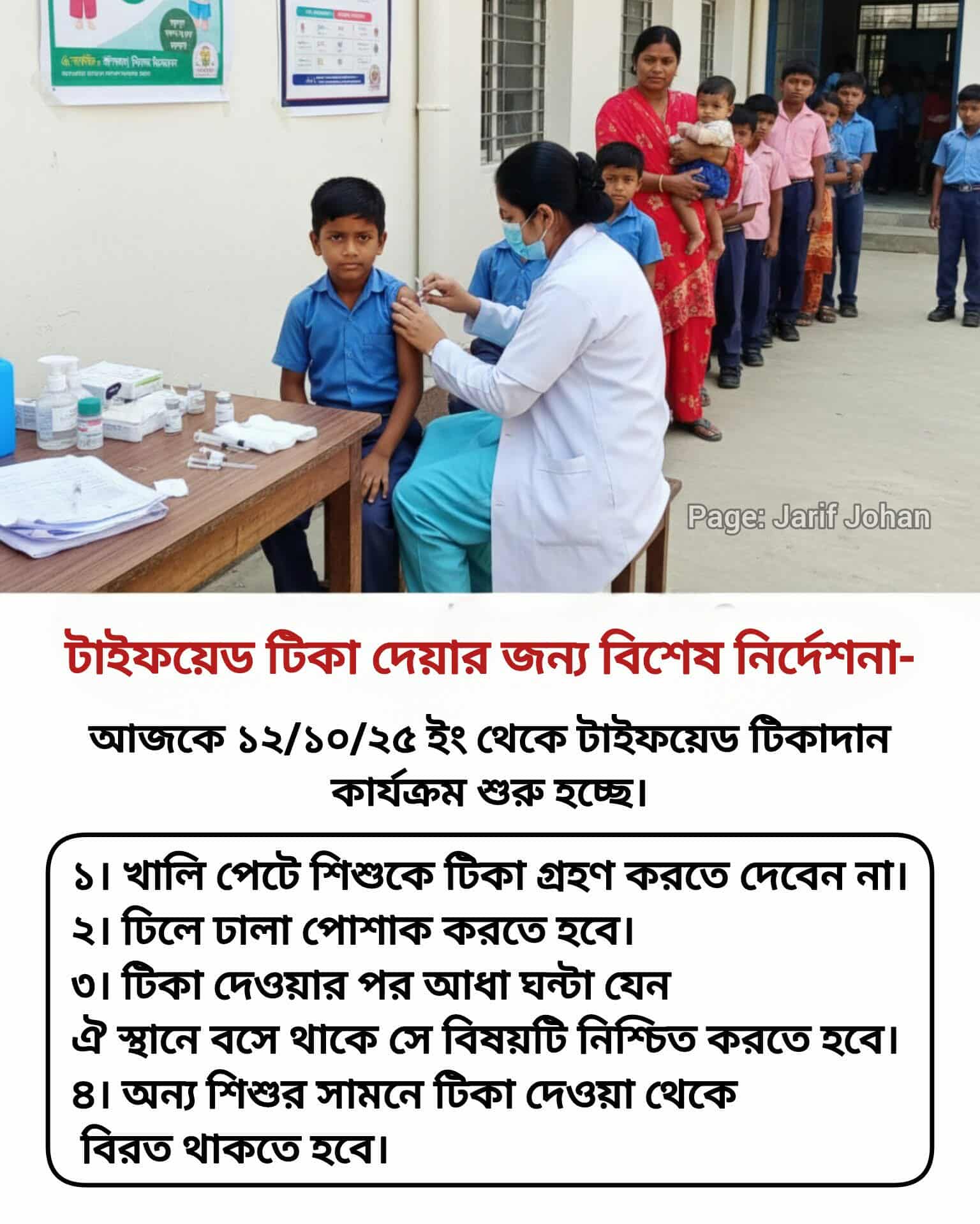 সকল অভিভাবক এর অবগতির জন্য জানানো যাচ্ছে যে, আগামী ২০।১০।২৫ ইং তারিখ (সোমবার) নৌ পরিবার শিশু নিকেতন মিরপুর-১৪ ঢাকা শাখায় টাইফয়েডের টীকাদান কর্মসূচি অনুষ্ঠিত হবে।