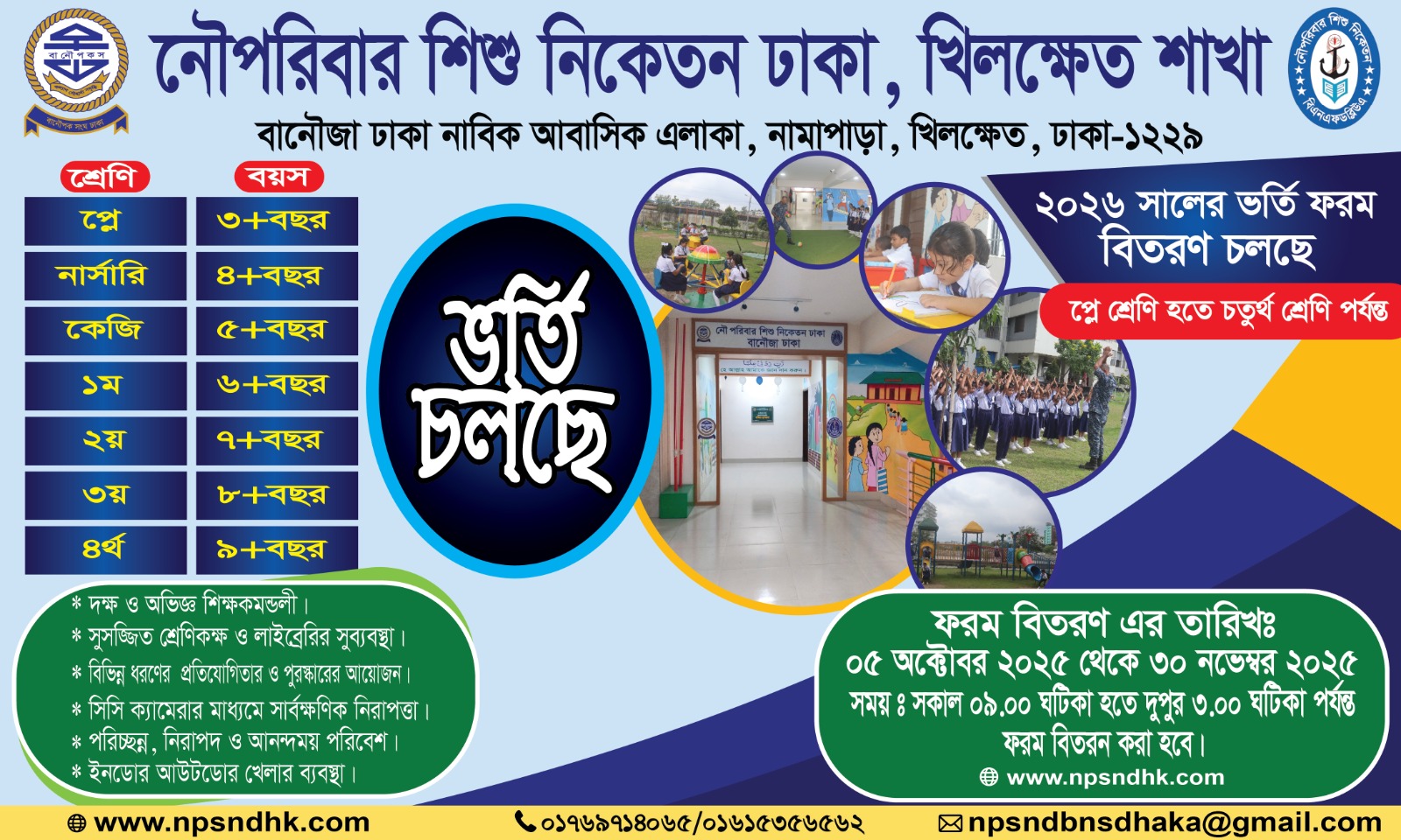 নৌপরিবার শিশু নিকেতন ঢাকা (মিরপুর-১৪) শাখা এর প্লে হতে পঞ্চম শ্রেণির সকল পুরাতন শিক্ষার্থীর অভিভাবকদের অবগতির জন্য জানানো যাচ্ছে যে, আগামী ১৫/১২/২০২৫ ইং হতে ২০/১২/২০২৫ ইং তারিখের মধ্যে অনলাইনে ভর্তি কার্যক্রম সম্পন্ন করার জন্য নির্দেশনা দেওয়া যাচ্ছে। অন্যথায়, উক্ত আসন শূণ্য বলে বিবেচিত হবে।